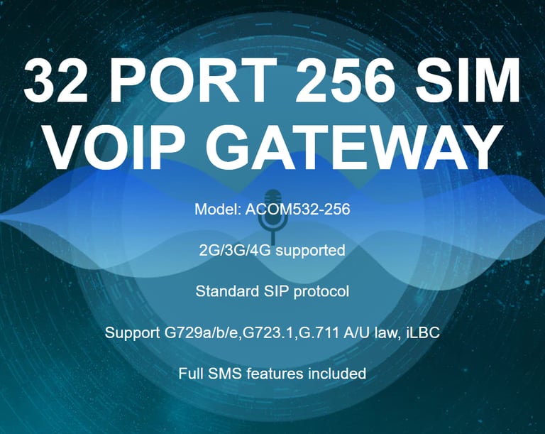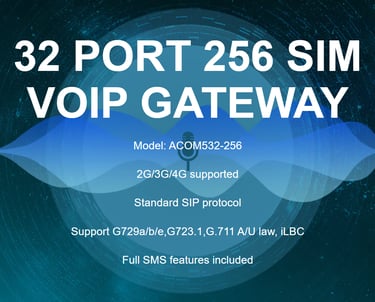 La puerta de enlace VoIP Ejointech ACOM532-256 es una puerta de enlace VoIP GSM de 32 puertos compatible con hasta 256 tarjetas SIM. Se utiliza principalmente para la terminación de llamadas (VoIP a móvil) y la originación (de móvil a VoIP). También puede utilizarse como módem SMS de red, compatible con el envío y la recepción de SMS.