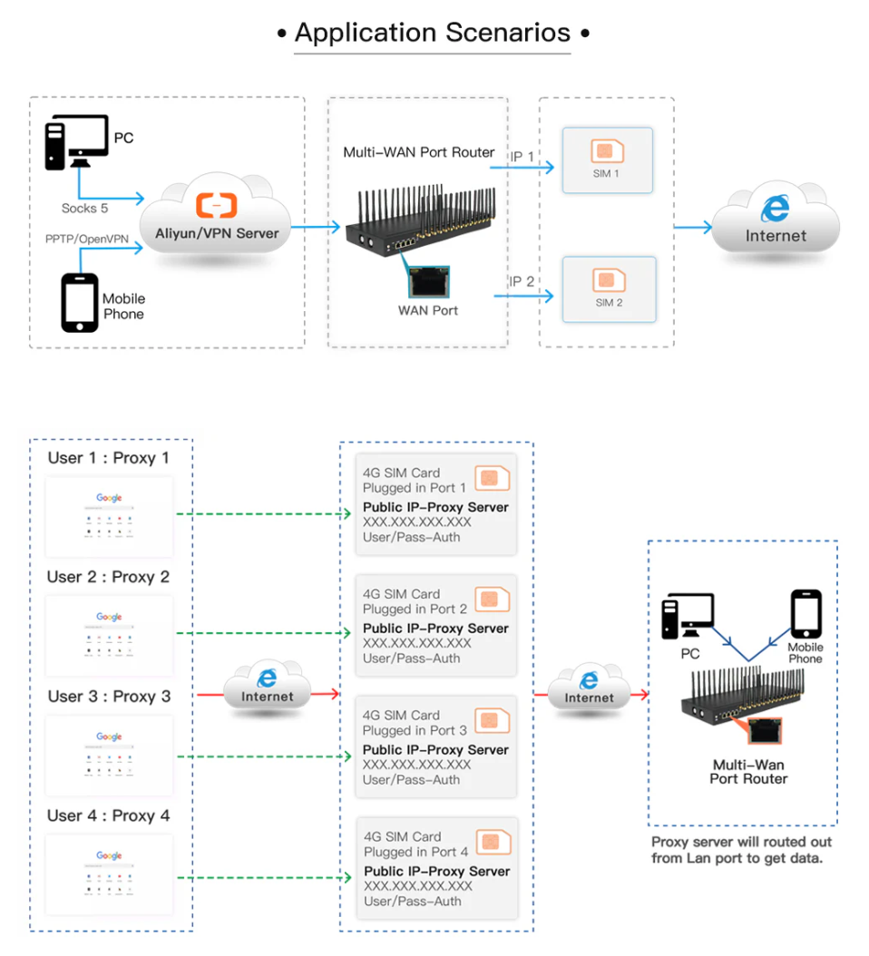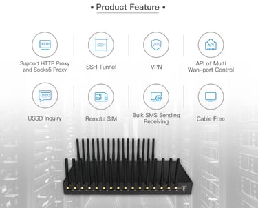 Ejointech ACOM716 IP Proxy Gateway es un producto multifuncional y de alto rendimiento que admite el envío y recepción de SMS, proxy IP, VPN, etc. Tiene 16 tarjetas SIM, con una función de remarcación para cambiar IP, un dispositivo puede generar cientos de IP, es ampliamente utilizado en investigación de mercado, monitoreo de precios, recopilación de datos, monitoreo de sitios web, comercio electrónico entre tableros, etc.