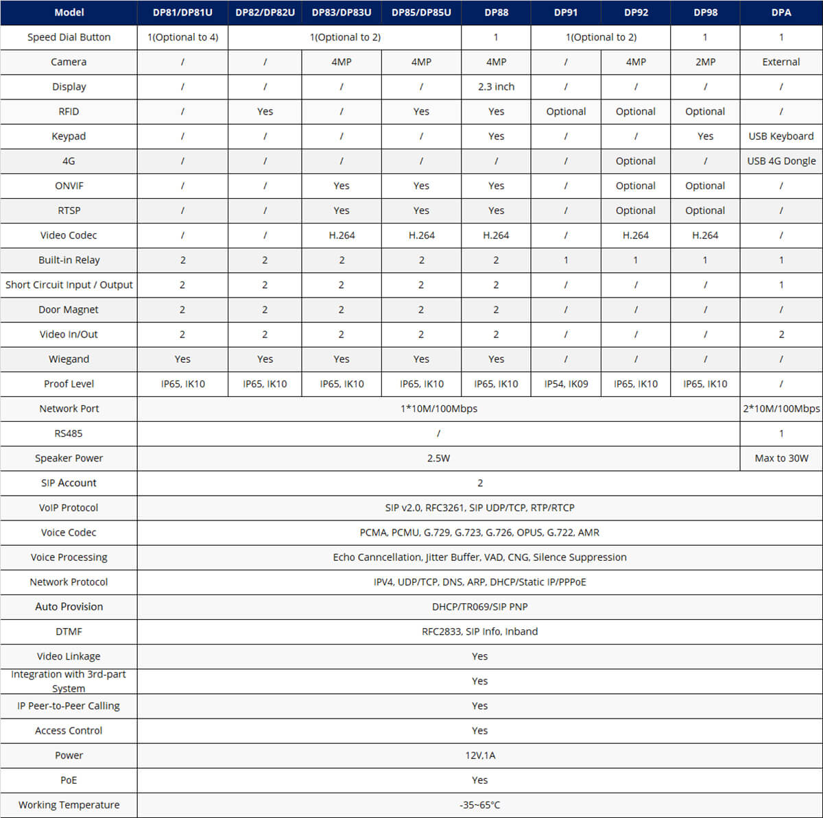 Door/Access Control: Options include DTMF, RFID, cards, and password support, along with active URI/URL actions for broader system integration.
