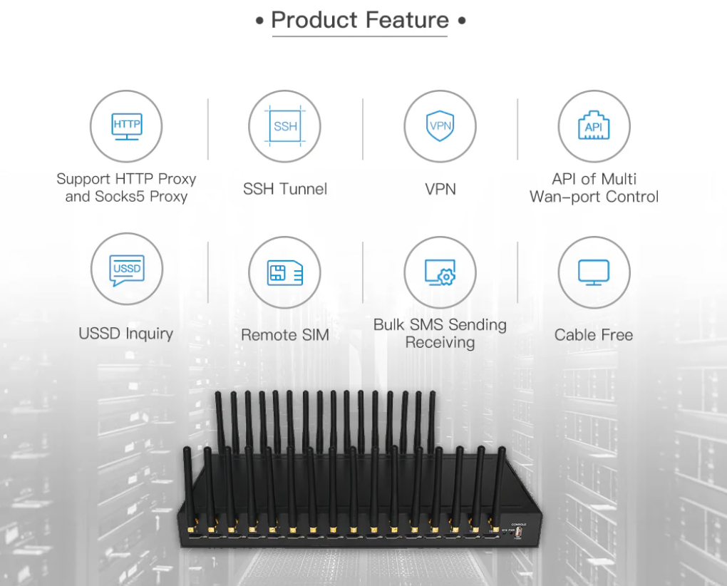 Ejointech ACOM716 IP Proxy Gateway es un producto multifuncional y de alto rendimiento que admite el envío y recepción de SMS, proxy IP, VPN, etc. Tiene 16 tarjetas SIM, con una función de remarcación para cambiar IP, un dispositivo puede generar cientos de IP, es ampliamente utilizado en investigación de mercado, monitoreo de precios, recopilación de datos, monitoreo de sitios web, comercio electrónico entre tableros, etc.